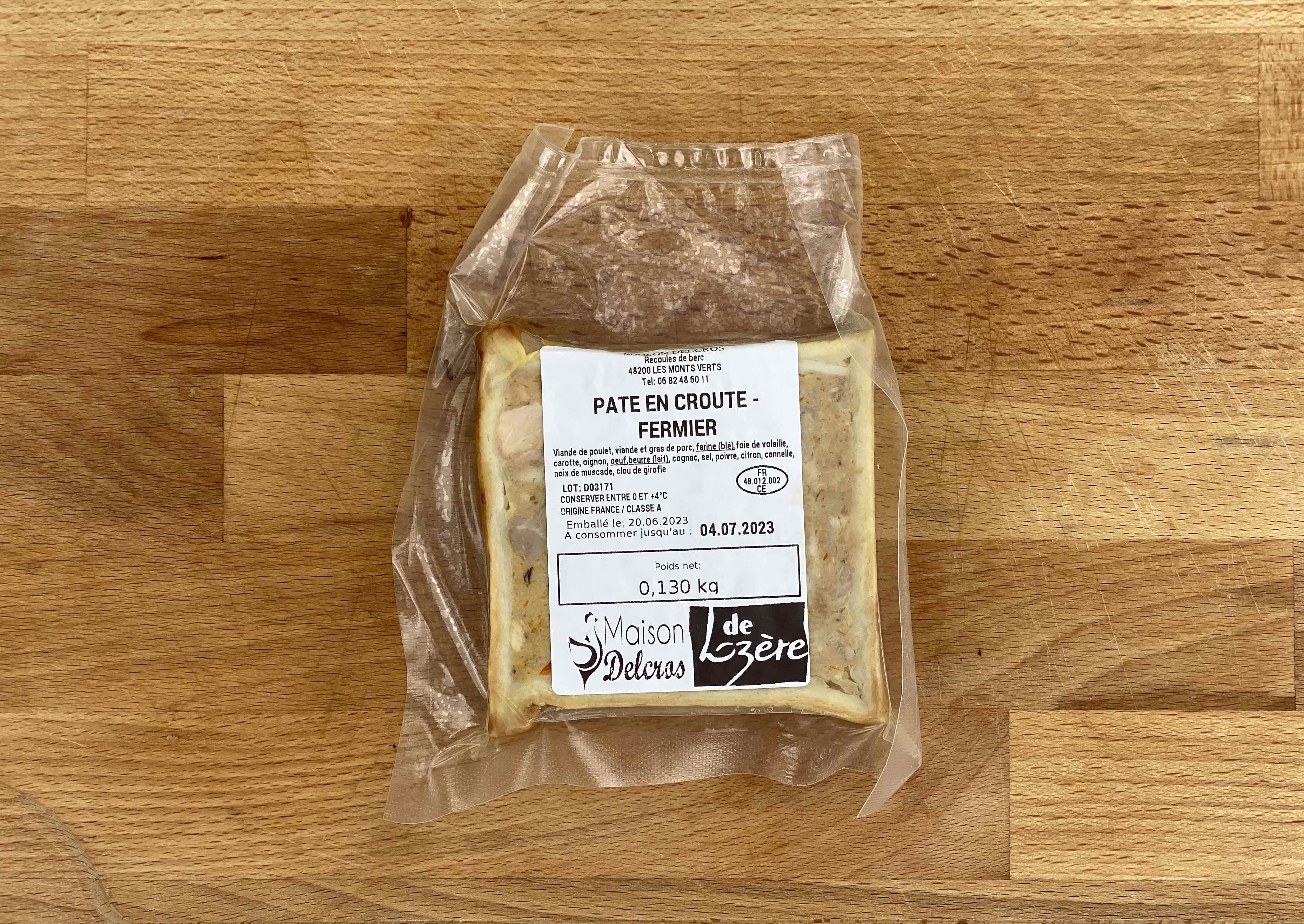 Pâté en croute issu de viande de poulet élevé à la ferme et en plein air pendant à minima 140 jours (contre 90 jours pour Label Rouge) ✊🏼 Dans ce Pâté Croûte, que du bon : viande de poulet, viande et gras de porc, farine (blé), foie de volaille, carotte, oignon, oeuf, beurre (lait), cognac, sel, poivre, citron, cannelle, noix de muscade & clou de girofle